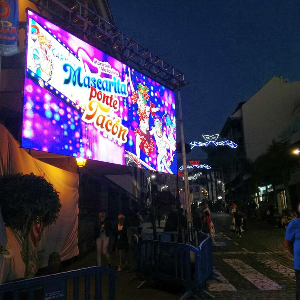 Por segundo año consecutivo hemos estado celebrando el evento más importante de los Carnavales del Puerto de La Cruz, el maratón Mascarita Ponte El Tacón. Hemos instalado tres Pantallas LED Gigantes por el recorrido (San Telmo, Calle Santo Domingo y Plaza del Charco) que retransmitían a los espectadores lo que sucedía en todo el recorrido.